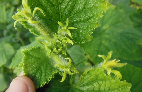 ?。?)溫度異常時造成黃瓜花打頂現(xiàn)象的主要原因,在生長前期時,晝夜溫差較大,會使葉片白天制造的養(yǎng)分不能及時運輸?shù)狡渌课唬瑢е氯~片濃綠皺縮,提高老化,影響光合作用。而在低溫情況下種植生長受到抑制,生殖生長超過營養(yǎng)生長,造成花打頂現(xiàn)象。在種植時要注意溫度的變化,在白天高溫時,加強棚室通風,降低棚內(nèi)溫度,而在晚上溫度較低時,封閉棚室,使棚內(nèi)溫度升高,減少晝夜溫差。